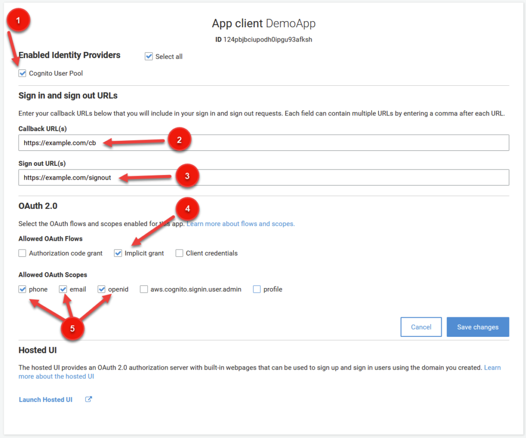 Firstly, as seen in (1) below, click Cognito User Pool under Enabled Identity Providers. This will tell cognito to use your User Pool that you just created as a source for your application. When we add Google as our Federated Identity Provider later on, we’ll have to come back to this menu to select it as well. But for now, selecting Cognito User Pool will do.