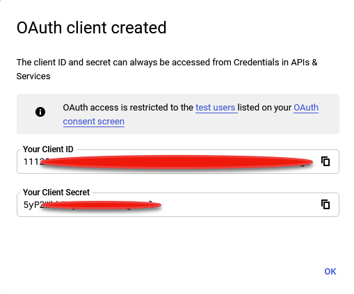Woohoo! you should now be greeted with a confirmation page providing your Client ID and Client Secret as seen below. Save these values in a notepad because we’re going to need them in our next and (almost) final step: connecting our Google IDP to Cognito.