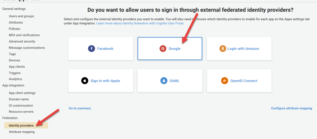 Now, we need to head back over to cognito to integrate our newly created Google Application with our Cognito User Pool. To do this, click on Identity Providers under the Federation section of the Cognito User Pool home page. From there, click on Google as the Identity Provider.