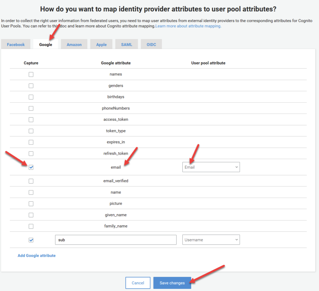 Firstly, make sure you have the Google tab selected at the top as per the image below. Under the row that says email, tick the lefthand checkbox under the Capture column. Under the User Pool Attribute Column, select Email from the dropdown list.
