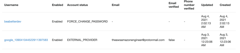Carrying on, below is a screenshot of a User Pool‘s users in a Demo pool I just created. The top being a user I created with a default username and password, and the bottom being an account created as a result of logging in via Google using Social Sign On.