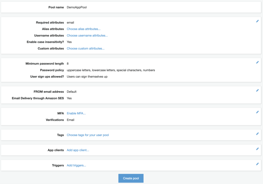 We’re not going to walk through each of the individual settings in this video, but I encourage you to go through them on your own time. They allow for customizations such as password strength, enabling Multi-factor authentication (MFA), and using Lambda to create ‘hooks’ at different stages of the OAuth2.0 login flow.