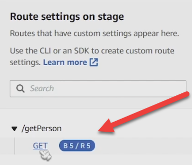 aws apigatewayv2 update-stage --api-id <YOUR API ID> --stage-name <YOUR STAGE> --route-settings '{"GET /getPerson": {"ThrottlingBurstLimit":5,"ThrottlingRateLimit":5}}'