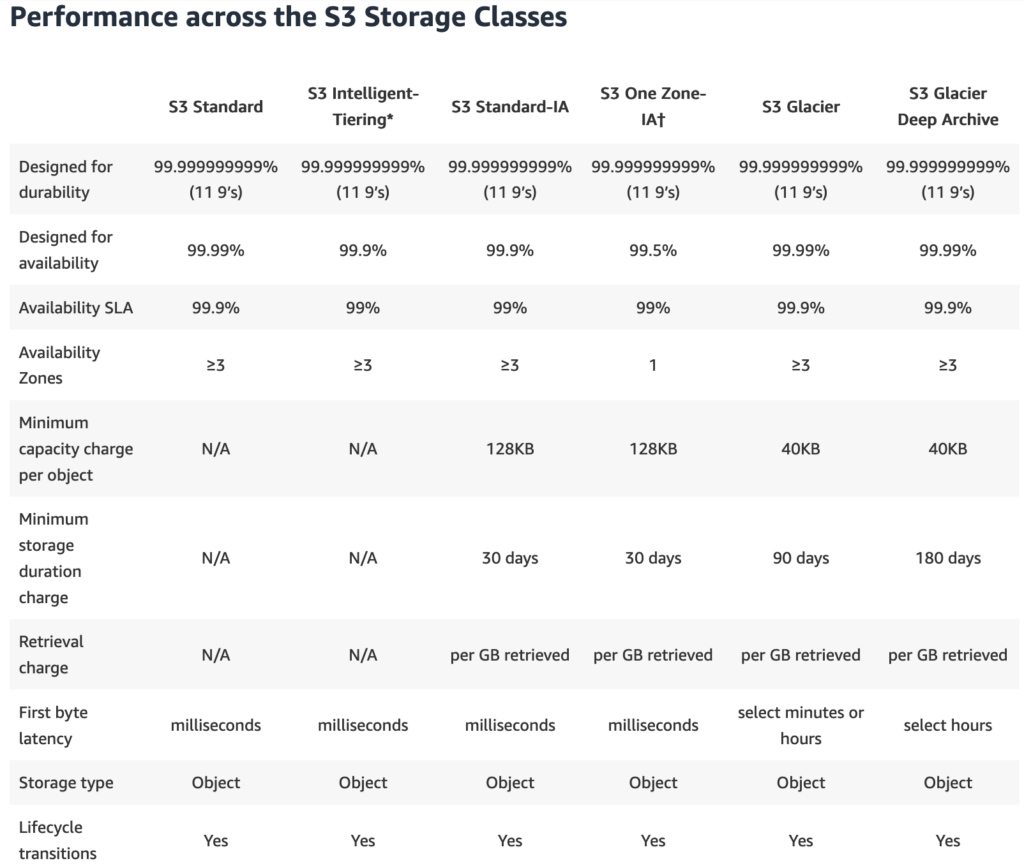 - One Zone IA – The same as Standard IA, except your data is only persisted in one availability zone instead of a minimum of 3. Has the lowest durability guarantees at 99.5% and comes with lower cost points.