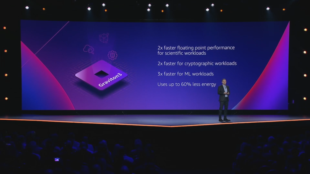 Adam started by introducing a new processor that follows the popular Graviton2 chip. You guessed it – he announced Graviton3.