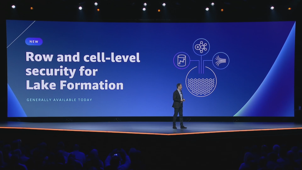 Firstly, he announced row and cell level security features for Lake Formation, a popular AWS service used to aggregate data from many different sources and store it in a secure and reliable way. Row and cell level security allow administrators to apply granular access controls to data tables to ensure data security isn’t compromised.