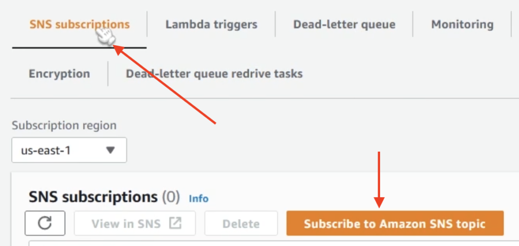 To do this through the console, navigate to your SQS queue and click on the SNS Subscriptions button. From there, click on the orange button that says Subscribe to Amazon SNS Topic as seen below.