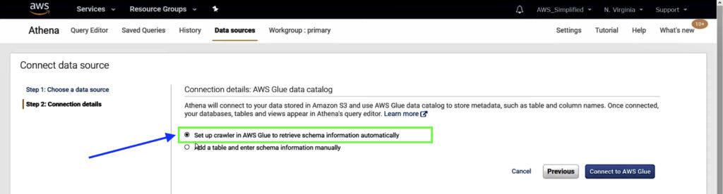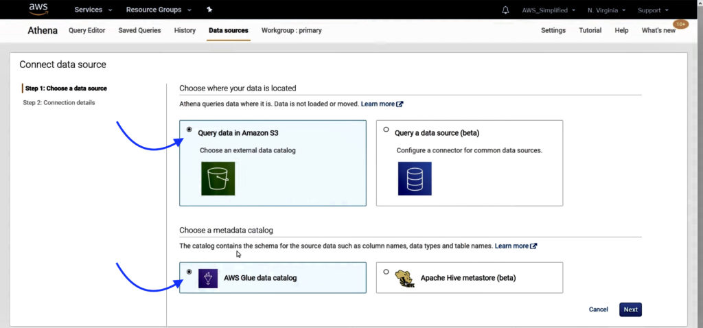 Choose where the data is located and metadata catalog. We are going to use query data in Amazon S3 since that’s where our raw data is and AWS Glue data catalog for getting schema for the source data.