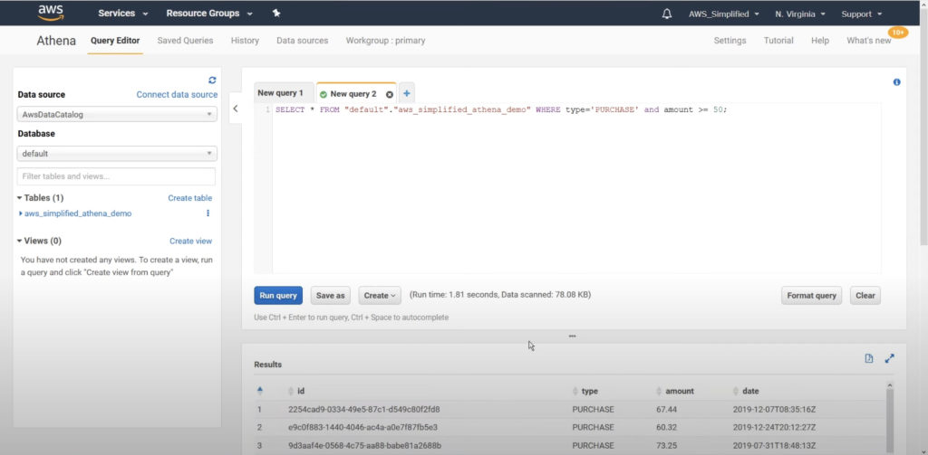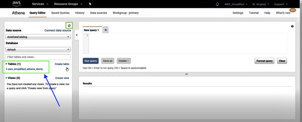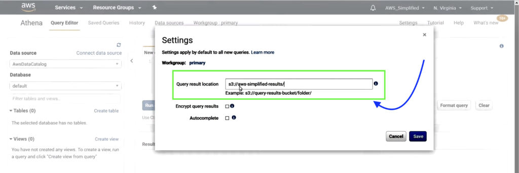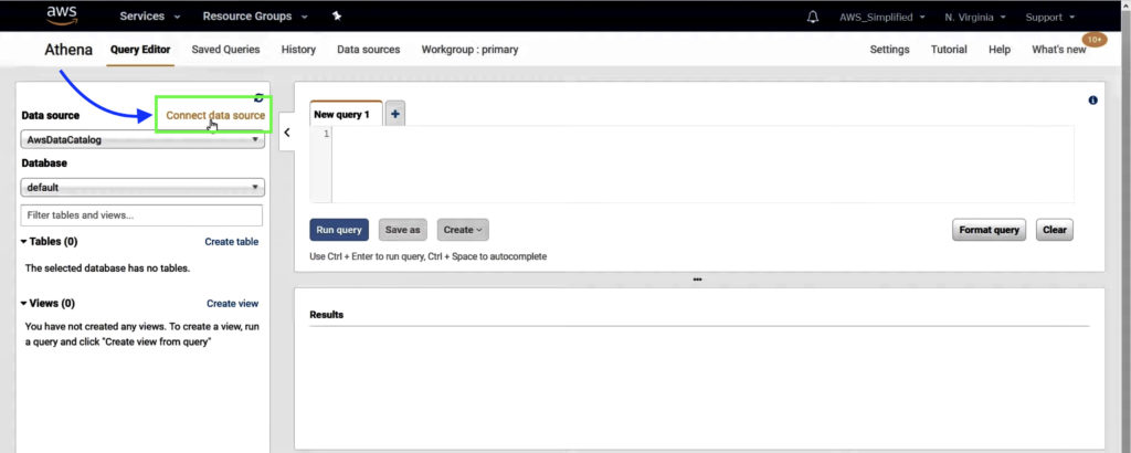 S3 bucket “aws-simplified-results” is to store the results of my SQL queries executed, which is empty as no queries are executed as of now.