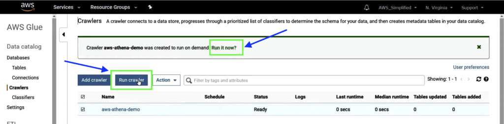 Run the Crawler we created in Step 4. You can either run it by clicking on the Run it now option, or select the Crawler created and click on the Run crawler button above.