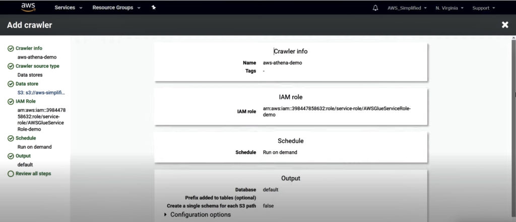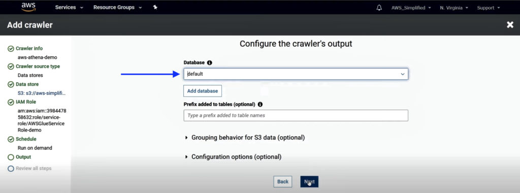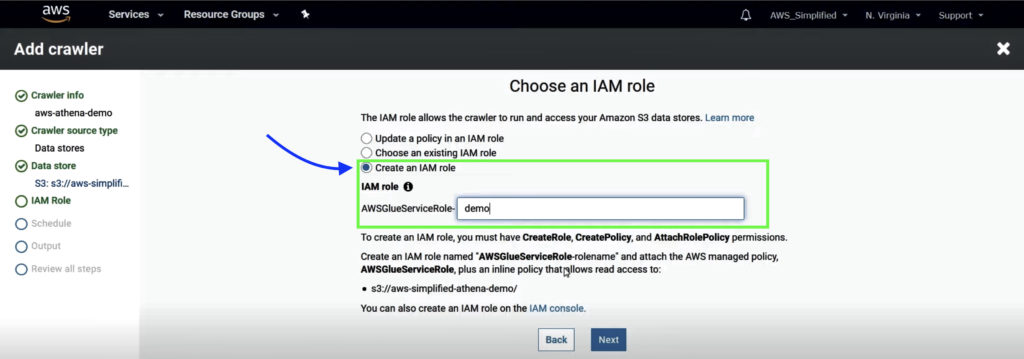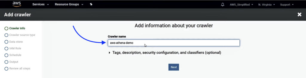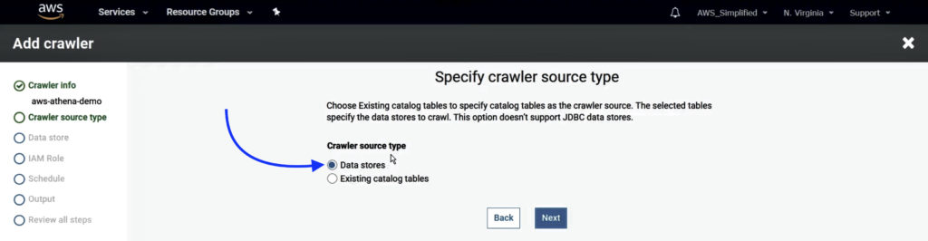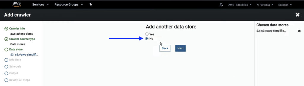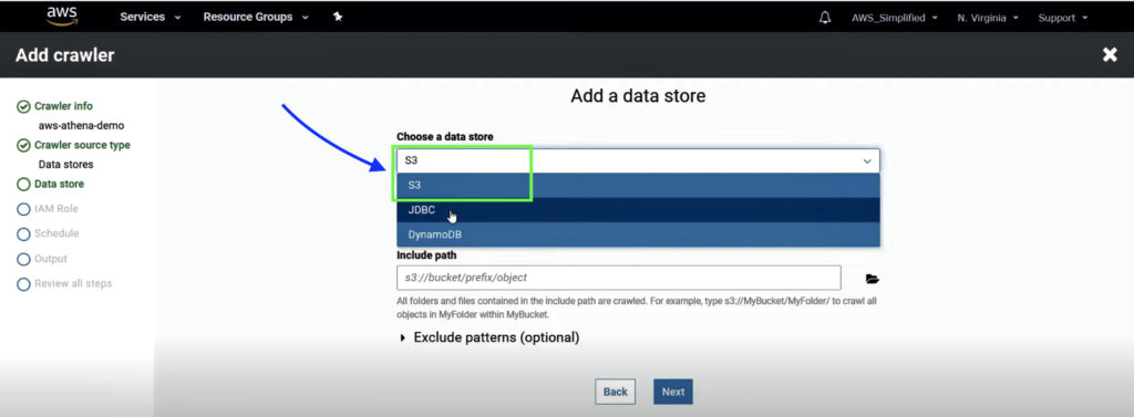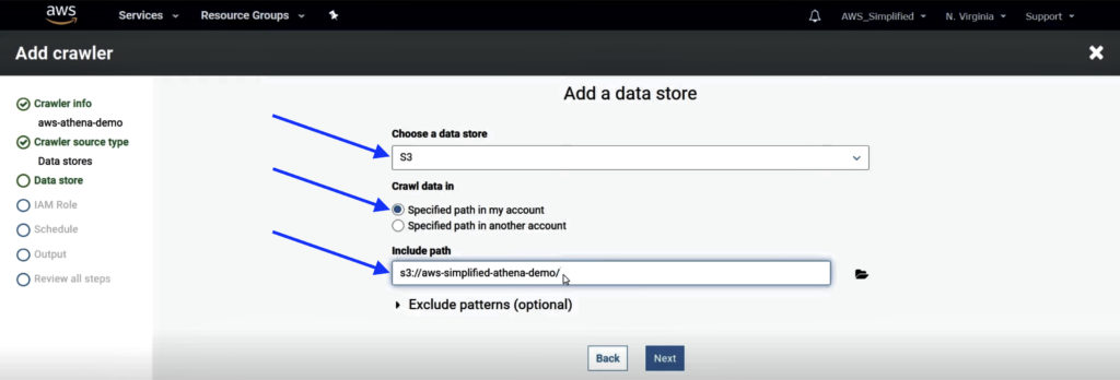 You can either enter exact path to point it to specific file (for example, “s3://aws-simplified-athena-demo/transactions.json”) or leave it at the path to the folder which might contain one or multiple files (for example, “s3://aws-simplified-athena-demo/”). With the latter option, crawler will read over all files located under that folder path to retrieve schema.