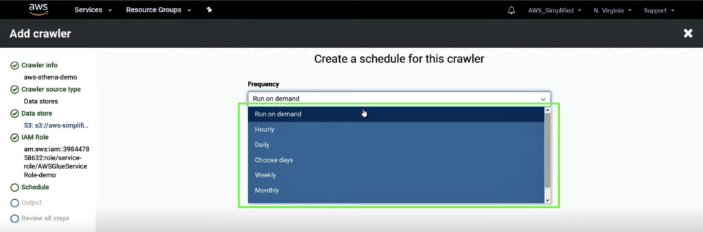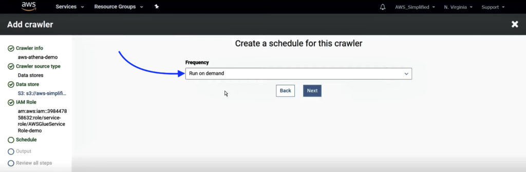 6. Select Run on Demand option as frequency to run crawler and click Next.