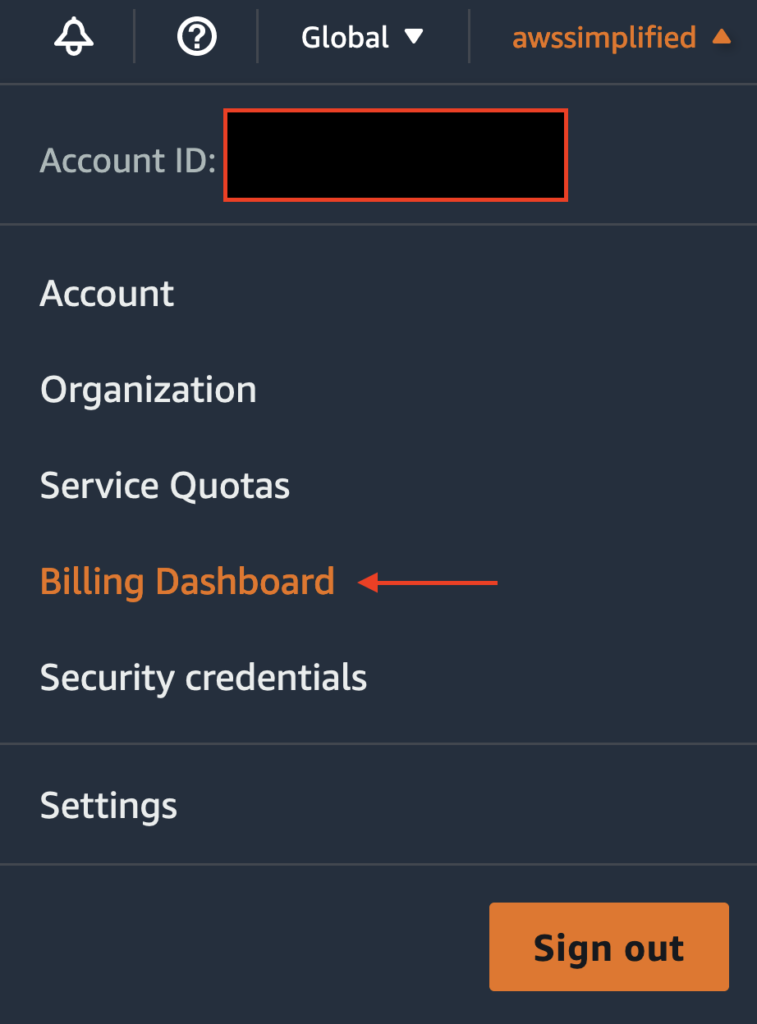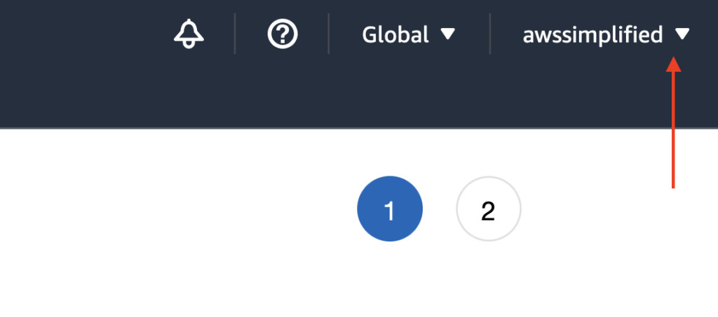 Our next step is to navigate to the billing dashboard. To do so, first log in to your AWS account. Next, click on your account name (or IAM user if you are not signed in as the root user) in the top right as seen below.