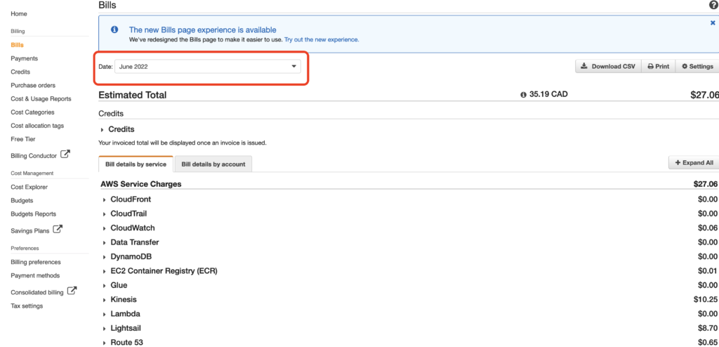 Notice you can change the date to see historic bills in the highlighted area. The AWS Service charges section is refreshed to show the current selected month.