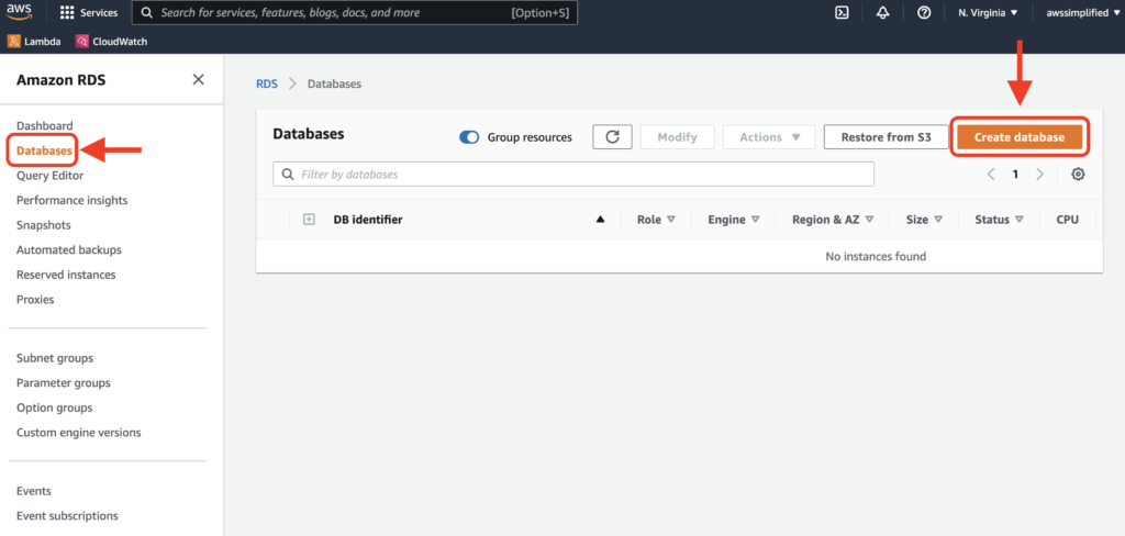 First thing’s first, head over to the AWS RDS (Relational Database Service) console. You can do this by typing in RDS in the AWS search bar or find it under the Database section of AWS services. You should land on the RDS landing page as seen below.