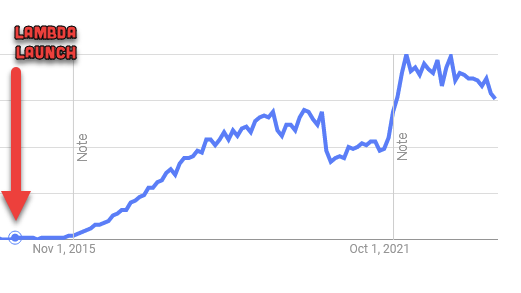 Lambda’s introduction of the “pay for what you use” and “scale down to zero” model quickly lured developers away from their hard metal setups and onto managed compute infrastructure. It’s around this time that the term “Serverless” really began to pick up steam, as the Google Search trend graph indicates below.