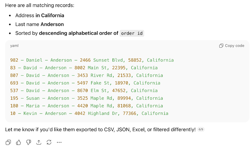 Earlier versions of ChatGPT—those without Agent support—would often respond with an answer that looks mostly correct like the screenshot below. Notice the results are all there, but the records are not sorted in descending as requested.