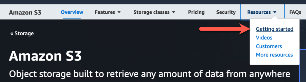 Almost every service I’ve come across has these types of Getting Started videos available. You can find them by navigating to the service on https://aws.amazon.com , clicking on Resources, and then Getting Started. Below is an image to give you a better reference.